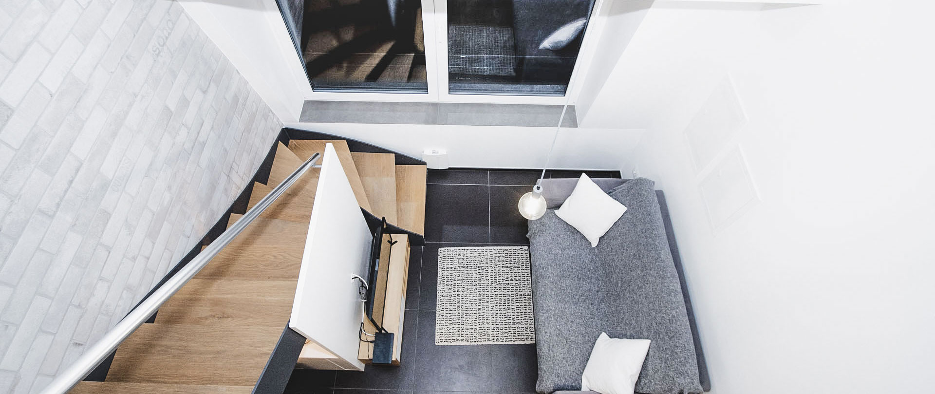 Upstairs on the mezzanine is a bedroom with a large double bed and a wardrobe. There is also directly to the left when going up the stairs a small office area located just under the skylight with electric blinds.